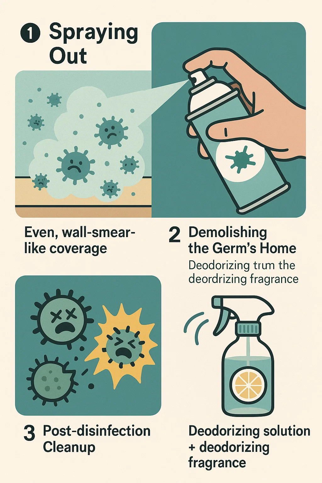| Quat-sprays | Langzaam maar grondig, blijft urenlang bewaken. | Banken, tapijten, voedselverpakkingen |