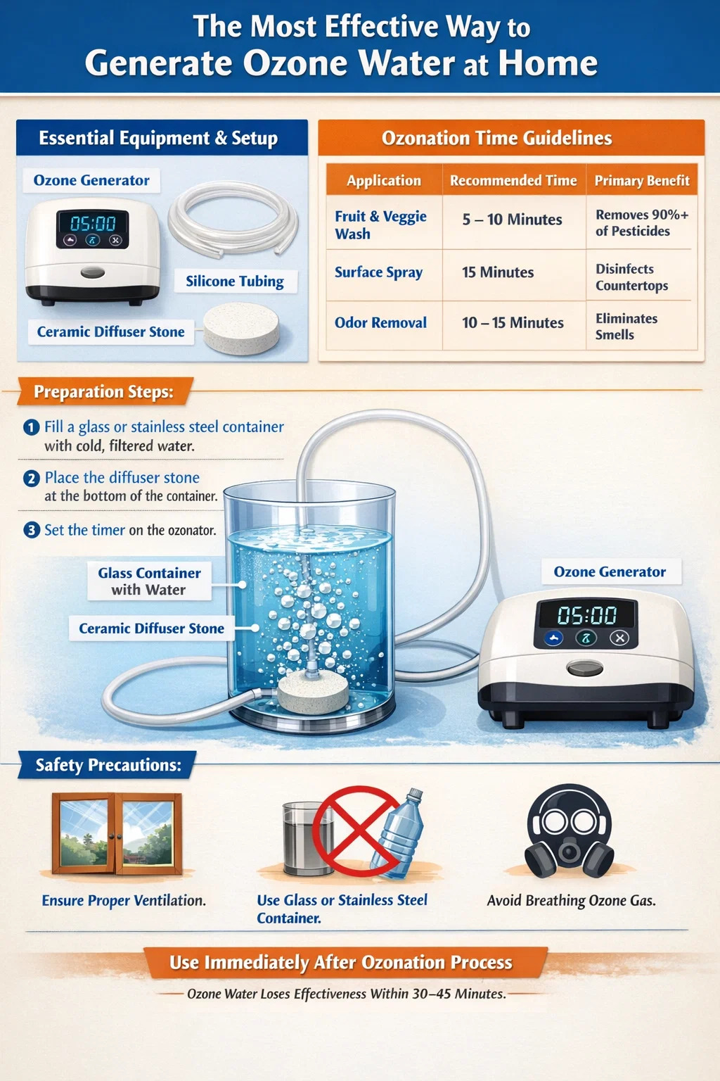 Effectief creëren ozon water thuis is de meest betrouwbare methode het gebruik van een residentiële ozongenerator (ook wel ozonisator genoemd) voorzien van een beluchtingssteen. Hoewel ozon van nature voorkomt, vereist het produceren van een concentratie die sterk genoeg is voor desinfectie een gecontroleerde elektrische ontlading om zuurstof om te zetten in ozongas, dat vervolgens in water wordt geborreld.