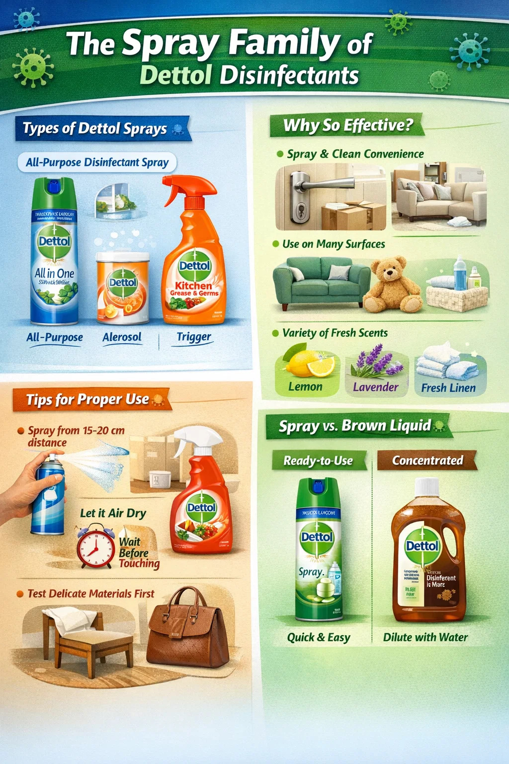 Simpel gezegd is de bruine desinfecterende vloeistof "geconcentreerd" en geschikt om te verdunnen met water voor algemene schoonmaak, wasgoed of dweilen; terwijl de desinfecterende spray "klaar voor gebruik" is en geschikt is voor snelle bescherming, altijd en overal.