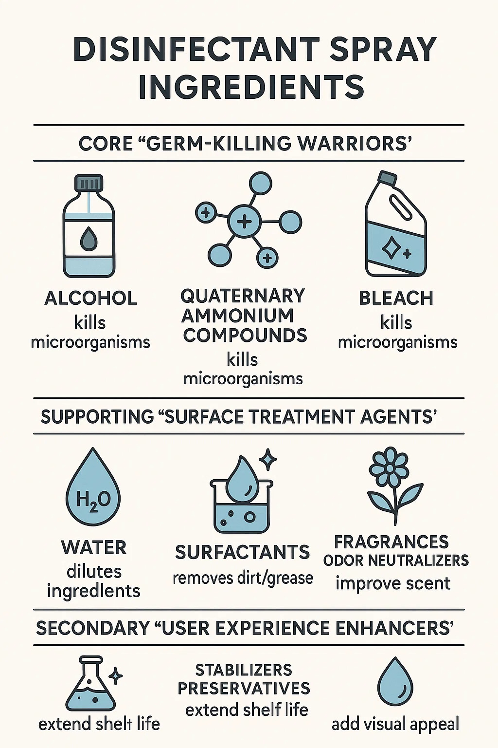 Voor het creëren van een effectief desinfecterende spray , kunnen de belangrijkste ‘held’-ingrediënten grofweg als volgt worden gecategoriseerd: